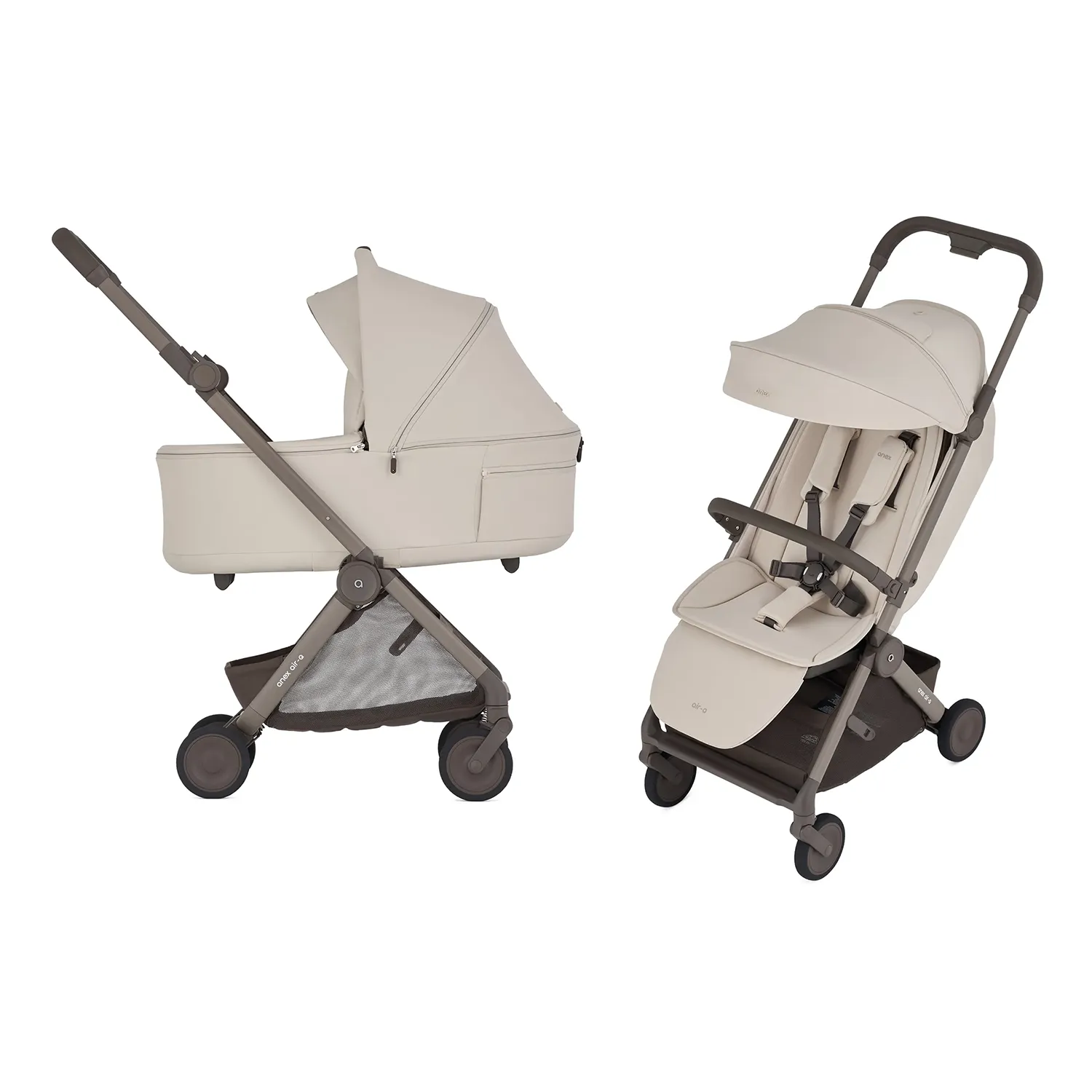 В комплект входит прогулочная коляска Anex Air-Q, люлька Air-Q, бампер для прогулочной коляски, подножка для прогулочной коляски.